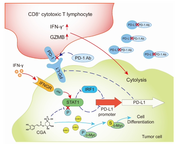 1、綠原酸通過誘導(dǎo)腫瘤細(xì)胞分化,抑制PD-L1表達(dá),增強(qiáng)腫瘤浸潤T細(xì)胞的活性,從而提升抗PD-1抗體的抗腫瘤效果。