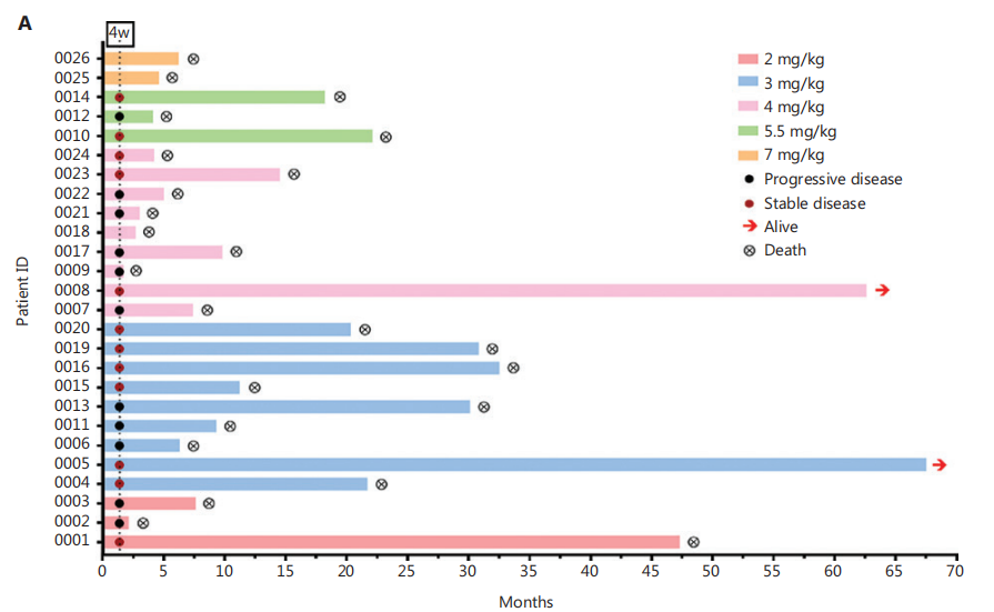 4、在23名可評(píng)估患者中,52.2%(12名)在第一個(gè)治療周期后達(dá)到疾病穩(wěn)定(SD)。