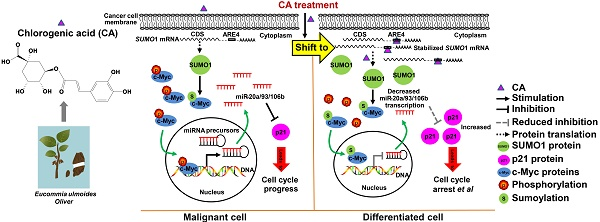 1、綠原酸通過作用于SUMO1的3'UTR區(qū)域,穩(wěn)定其mRNA并增加其表達,導(dǎo)致c-Myc的SUMO化、miR-17家族的下調(diào)和p21的上調(diào),最終導(dǎo)致G0/G1期阻滯和成熟表型。