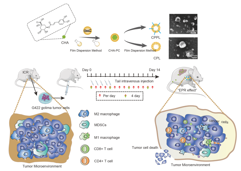這篇論文研究了綠原酸(CHA)作為潛在的癌癥免疫治療劑,特別是通過制備含有CHA-磷脂復(fù)合物(PC)的聚乙二醇化脂質(zhì)體(CHA-PC PEG-Lipo,簡(jiǎn)稱CPPL)來降低給藥頻率。