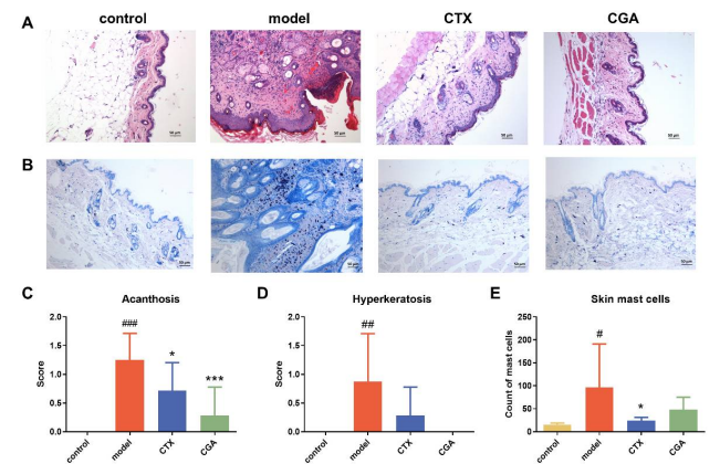 2、綠原酸顯著減輕了MRL/lpr小鼠的表皮層損傷和真皮肥大細(xì)胞數(shù)量,表皮層增厚和角化過(guò)度的發(fā)生率顯著降低。