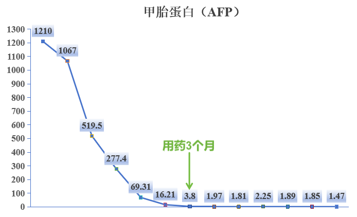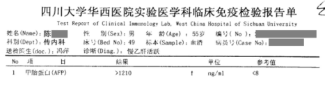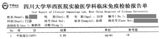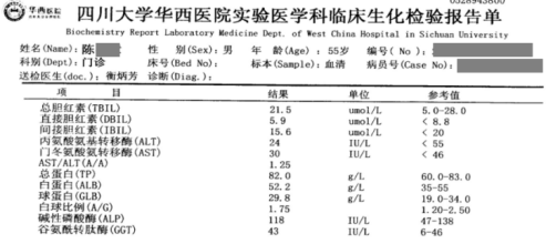 患者用藥前影像學(xué)檢查報(bào)告顯示肝多發(fā)囊腫,甲胎蛋白(AFP)高達(dá)1210ng/ml(大面積肝壞死),醫(yī)院建議必須換肝,而且還不能保證患者是否可以獲得有效治療。 患者未采用手術(shù),隨后5年期間,患者長(zhǎng)期使用注射用綠原酸,未使用其他任何治療;5年后改為口服保健食品九樟牌咀嚼片(每年注射1個(gè)療程注射用綠原酸)。維持至今,患者各項(xiàng)指標(biāo)均保持正常水平,身體狀況良好,與常人無異。