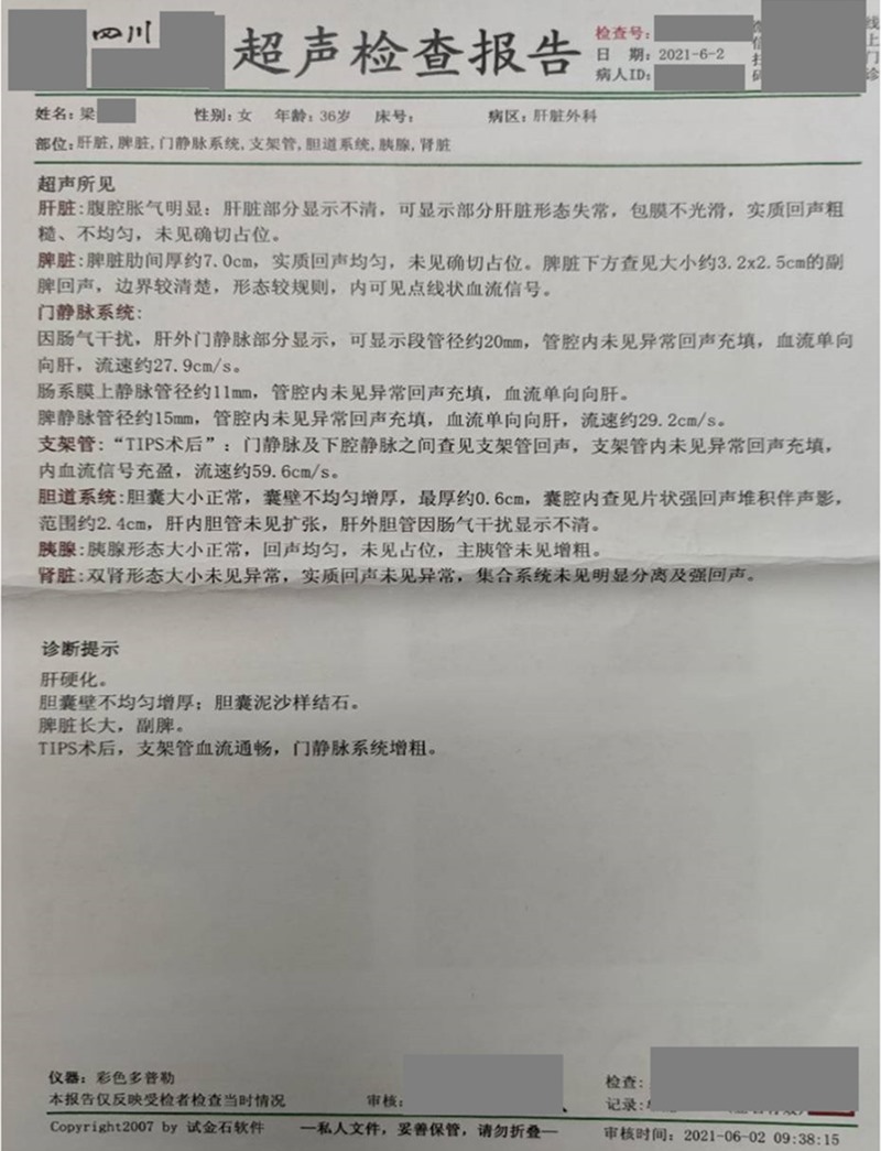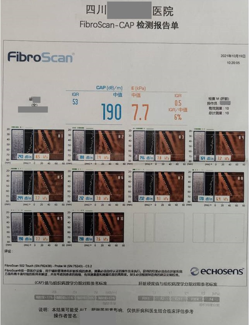 用藥前患者臨床診斷為肝硬化,脾臟腫大。確診肝硬化后的幾年間,患者采取多種治療方式,并調(diào)節(jié)飲食,肝硬度指標(biāo)有逐年好轉(zhuǎn)的趨勢(shì),但硬度仍處于較高數(shù)值。單獨(dú)使用注射用綠原酸1個(gè)月后,肝硬度指標(biāo)好轉(zhuǎn)(8.5→7.7),而且一直沒法解決的脾臟腫大問題,也得到了改善,脾臟厚度變?。?.0cm→5.7cm)?;颊叱掷m(xù)用藥至今,生活質(zhì)量得到較大改善,自我感覺精力變好,睡眠改善,食欲增強(qiáng),手指腫脹也基本消失。