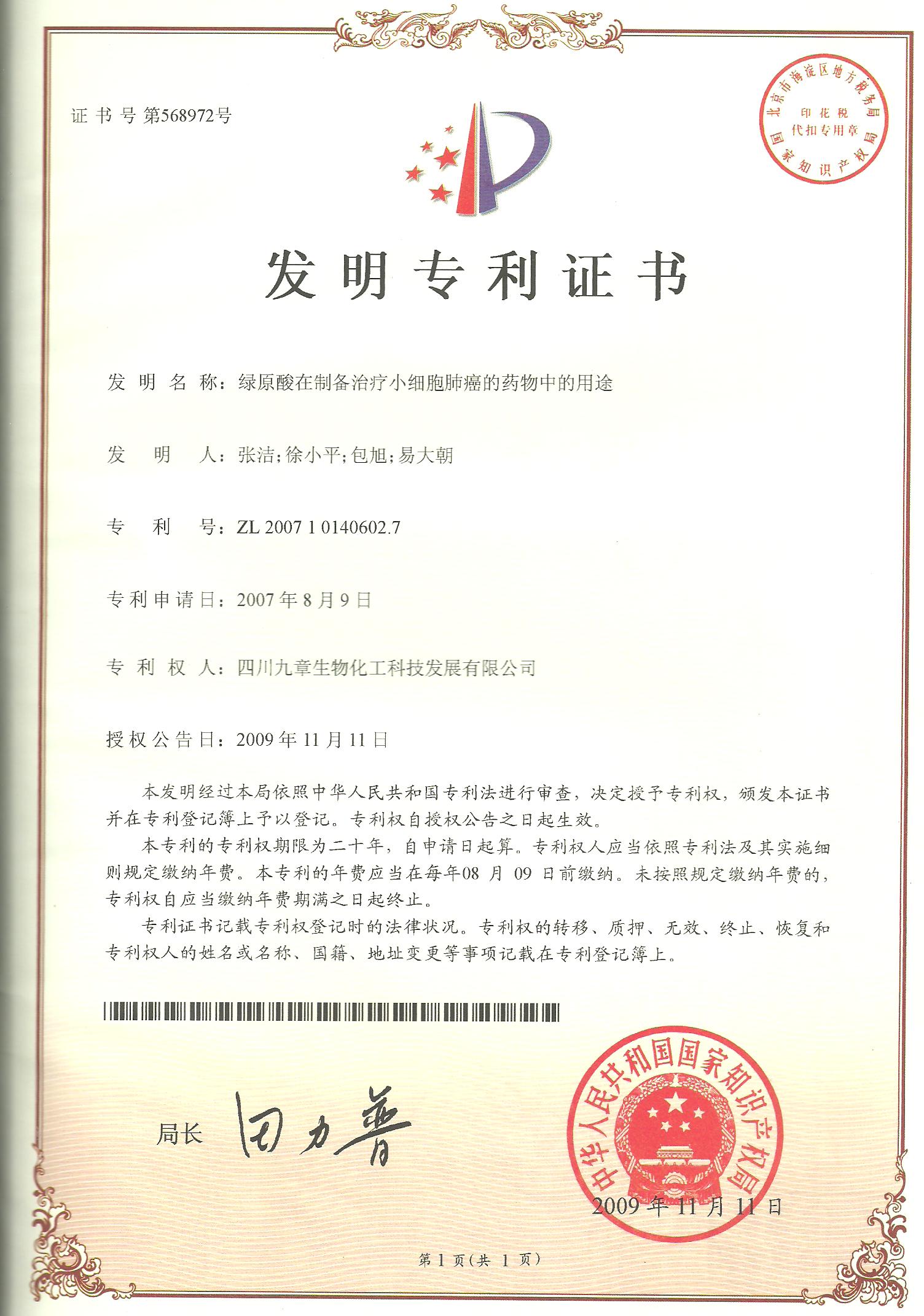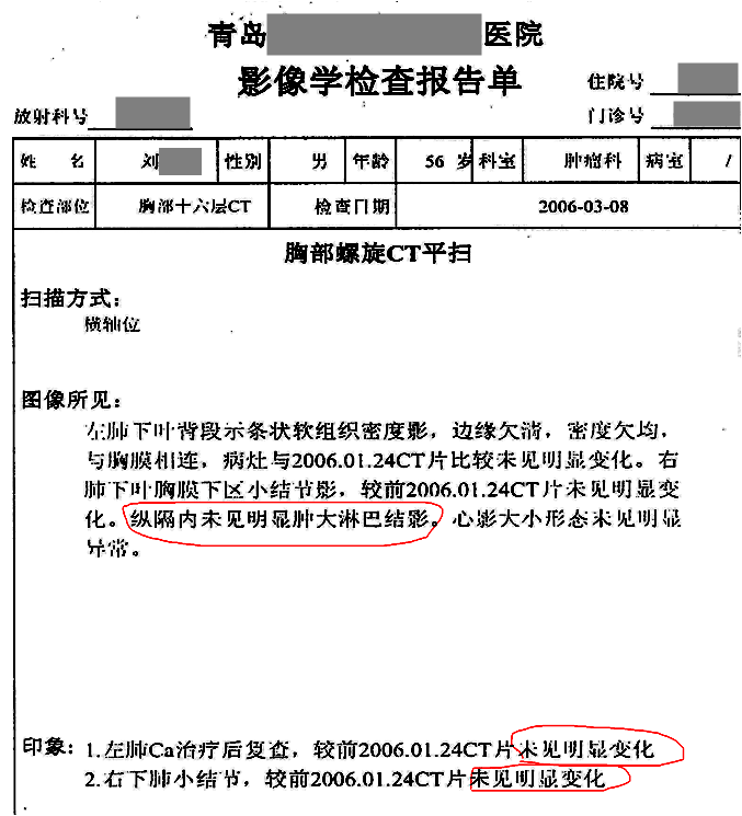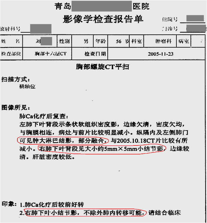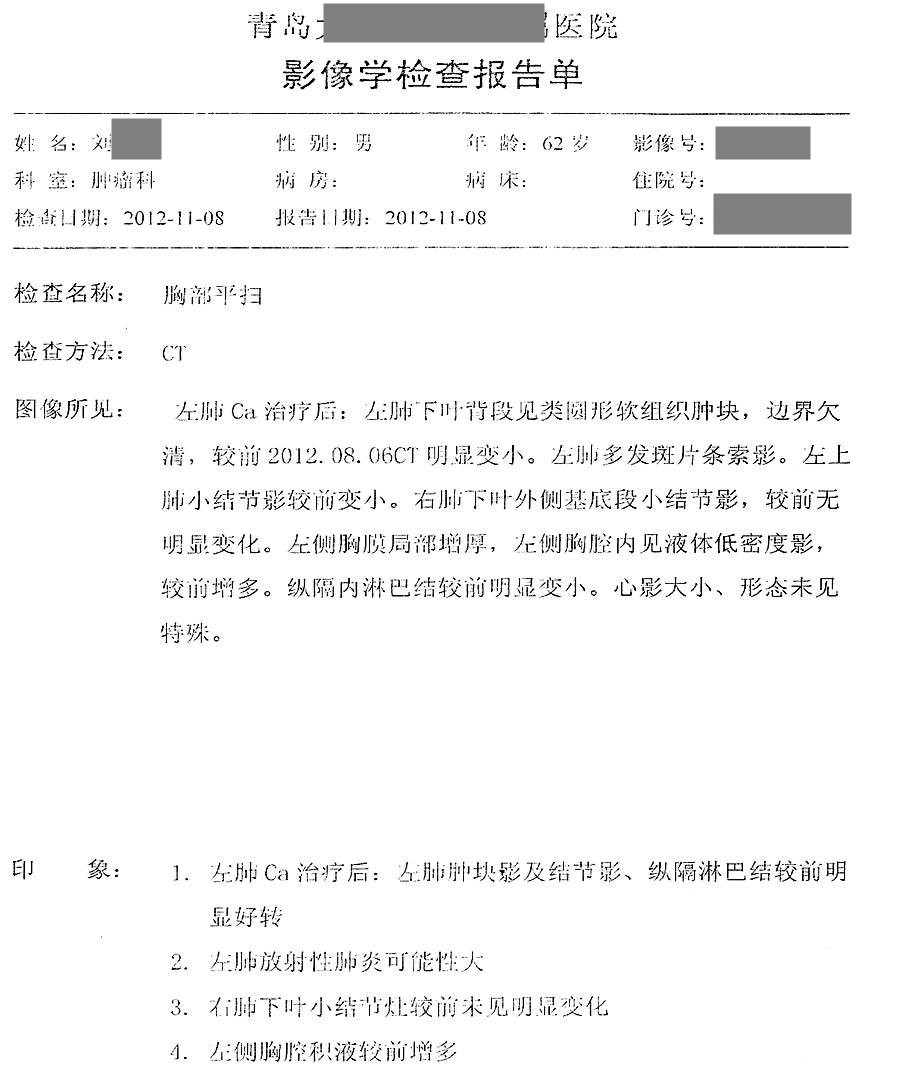 用藥前患者確診為左側(cè)小細(xì)胞肺癌,由于靠近血管無法手術(shù),只進(jìn)行化療,期間胸部CT發(fā)現(xiàn)有肺癌淋巴結(jié)轉(zhuǎn)移的可能,停止在醫(yī)院治療,隨后開始單獨(dú)使用注射用綠原酸,沒有使用其他藥物。用藥3個月后,CT顯示轉(zhuǎn)移淋巴結(jié)病灶消失。用藥7年半,期間血生化指標(biāo)基本正常,腫瘤標(biāo)志物一直在正常范圍值內(nèi),病情穩(wěn)定,目前患者生活狀態(tài)良好,與常人無異,已延長生存期13年。